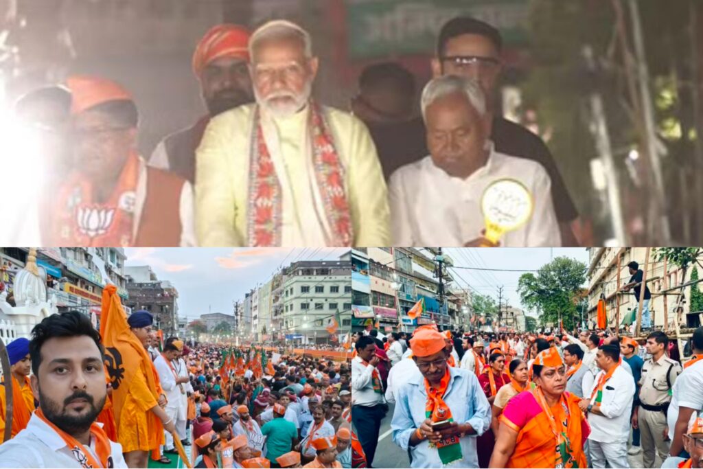 पीएम मोदी पटना के भट्टाचार्या मोड़ पर रोड शो में शामिल हो चुके हैं। सीएम नीतीश कुमार, डिप्टी सीएम सम्राट चौधरी, विजय सिन्हा ने उनका भव्य स्वागत किया। पीएम मोदी अपनी गाड़ी से उतर कर रथ पर सवार हुए। उनके साथ रथ पर सीएम नीतीश कुमार, रविशंकर प्रसाद और सम्राट चौधरी हैं। वहीं भाजपा नेता नितिन कुमार भारी संख्या में अपने कार्यकर्ता के साथ भीड़ के हिस्सा बनें और वहीं कई समाजिक कार्यकर्ता भी बढ़ चढ़ के इस रोड शो में भाग लिया जिसमें आदित्य के लोग भी प्रभु श्रीराम के जयकारे लगा रहे थे।