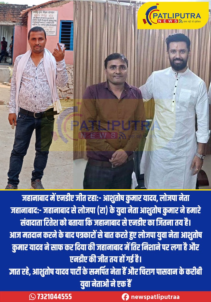 जहानाबाद:- जहानाबाद से लोजपा (रा) के युवा नेता आशुतोष कुमार ने हमारे संवादाता रितेश को बताया कि जहानाबाद से एनडीए का जितना तय है।आज मतदान करने के बाद पत्रकारों से बात करते हुए लोजपा युवा नेता आशुतोष कुमार यादव ने साफ कर दिया की जहानाबाद में तिर निशाने पर लगा है और एनडीए की जीत तय हों गई है।ज्ञात रहे, आशुतोष यादव पार्टी के समर्पित नेता हैं और चिराग पासवान के करीबी युवा नेताओं ने एक हैं