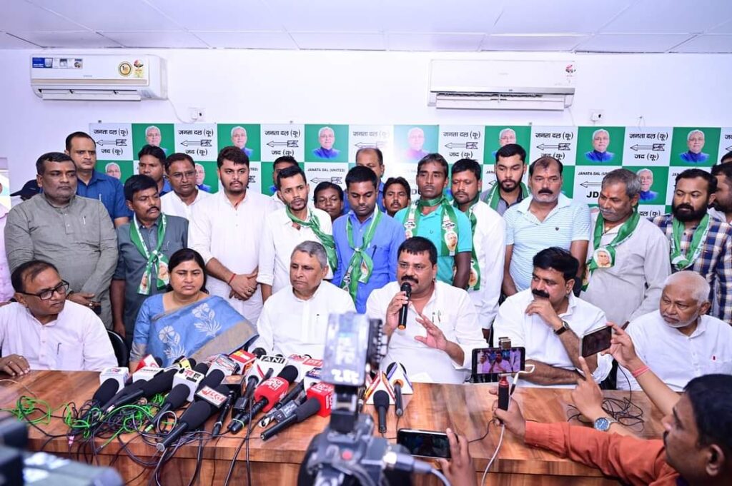 पार्टी के नए साथी मिशन-2025 की कामयाबी में अपनी अहम भूमिका निभाएंगे: उमेश सिंह कुशवाहा…पाटलिपुत्रा न्यूज @डेस्क, पटना : मंगलवार को प्रदेश कार्यालय, पटना में समस्तीपुर जिला के राजद के प्रमुख साथियों ने जनता दल (यू0) का दामन थामा। पार्टी के माननीय प्रदेश अध्यक्ष श्री उमेश सिंह कुशवाहा एवं बिहार सरकार के माननीय जल संसाधन मंत्री श्री विजय कुमार चैधरी ने उन्हें पार्टी की प्राथमिक सदस्यता दिलाई। इस मौके पर बिहार सरकार के खाद्य एवं उपभोक्ता संरक्षण मंत्री लेसी सिंह,अल्पसंख्यक कल्याण मंत्री जनाब जमा खां, विधानपार्षद संजय कुमार सिंह उर्फ ‘गांधी जी’, पूर्व विधायक अरुण मांझी, पार्टी के प्रदेश महासचिव चंदन कुमार सिंह, अरुण कुमार सिंह, वासुदेव कुशवाहा, प्रो0 नवीन आर्या चंद्रवंशी एवं पार्टी के अन्य साथीगण मौजूद रहे।….